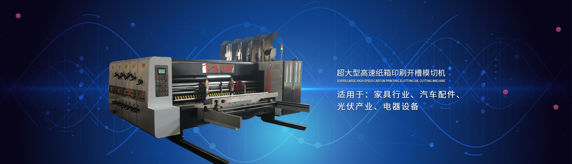 主要產品有高速印刷開槽模切機、半自動水墨印刷開槽模切機、全自動粘箱打包聯動線、全自動 插格機、半自動粘箱機、半自動釘箱機、手動釘箱機、薄刀分紙機、PE繩打包機、PP帶智能打包 機、圓壓圓模切機、平壓壓痕機、自動裱紙機、水墨污水處理機等產品
